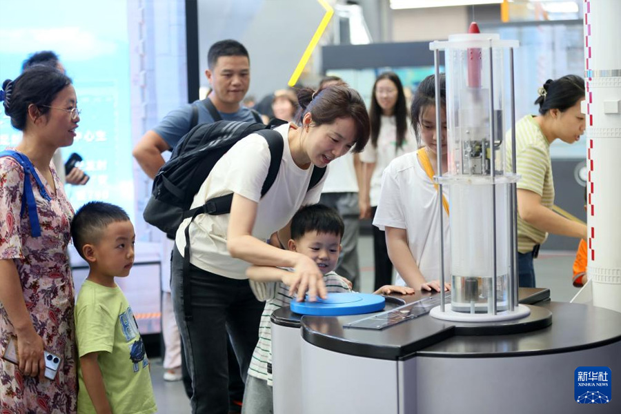 7月5日,家长带着孩子在四川科技馆体验科普设备。(新华社发 李华时/摄)