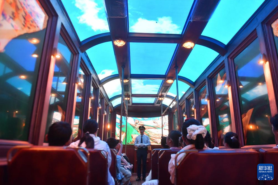 7月6日,小学生在位于山东省青岛市中山路的数字电车里听解说员介绍。(新华社发 王海滨/摄)