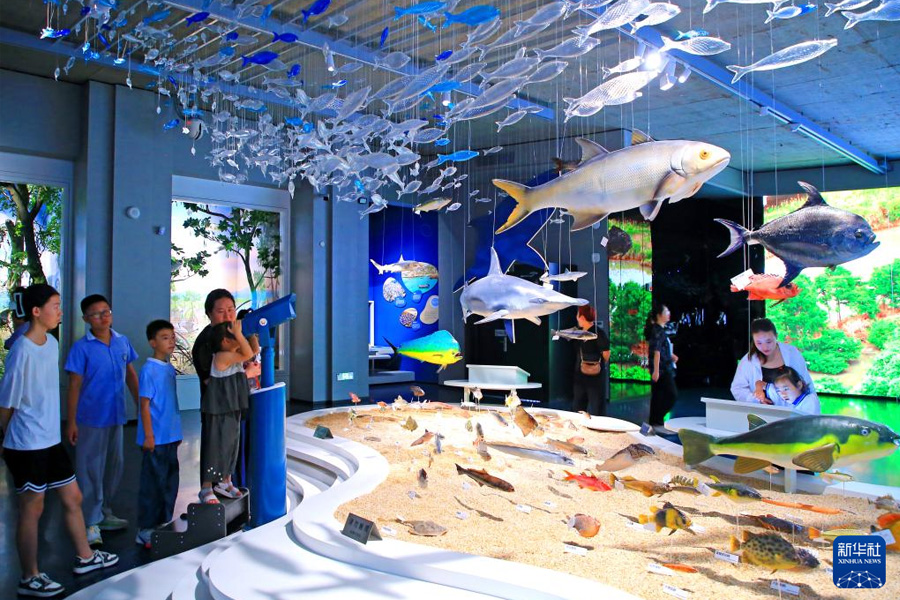 7月6日,家长带着孩子在位于浙江省玉环市的玉环博物馆参观游览。(新华社发 段俊利/摄)