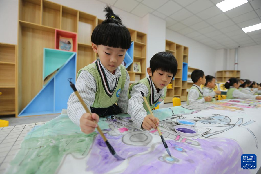 9月28日,甘肃省定西市安定区幼儿园的小朋友在绘制《我爱你中国》长卷。(新华社发 王克贤/摄)
