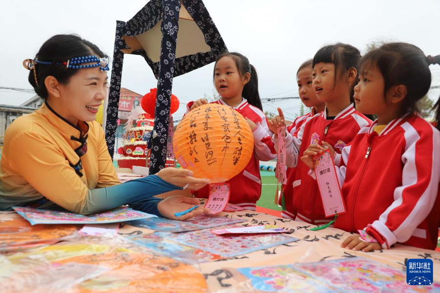 9月28日,在山东省滨州市沾化区冯家镇李家幼儿园,孩子们在“拾趣品中秋 童心迎国庆”活动上猜灯谜。(新华社发 贾海宁/摄)