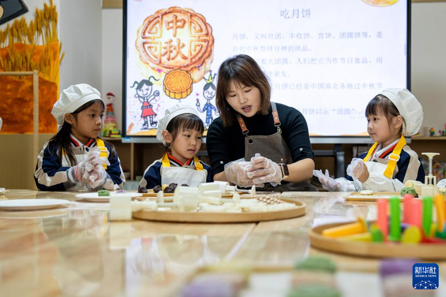 9月29日,在河南省商丘市睢县古襄路幼儿园,小朋友们在老师的讲解下学习制作冰皮月饼,了解中秋习俗。(新华社发 徐泽源/摄)