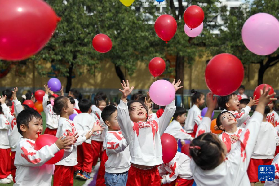 9月29日,河南省平顶山市宝丰县闹店镇中心幼儿园的孩子们在放飞气球。(新华社发 何五昌/摄)