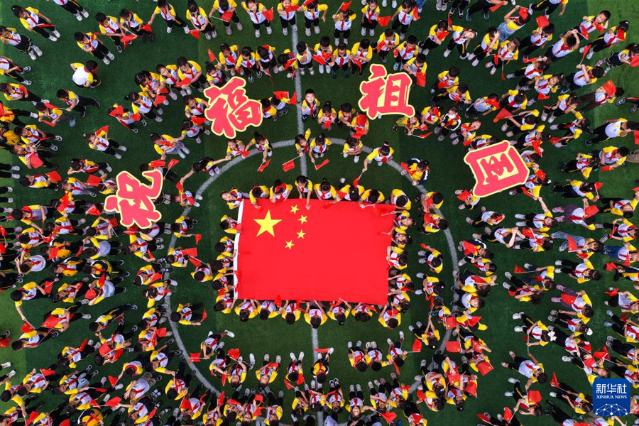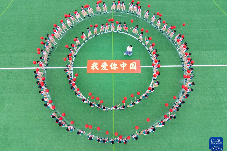 9月28日,江苏省泰州市姜堰区东桥小学教育集团东板桥校区学生学唱爱国歌曲,迎接国庆节(无人机照片)。(新华社发 周社根/摄)