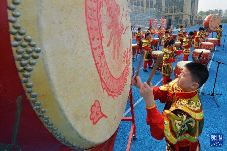 9月29日,在山东青岛启润实验学校举行的迎国庆主题活动中,学生表演鼓舞。(新华社发 王海滨/摄)