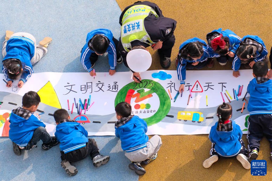 12月1日,浙江省湖州市长兴县水口乡中心幼儿园,长兴县公安局水口派出所交警中队工作人员与小朋友一起绘制交通安全主题画卷。(新华社发 谭云俸/摄)