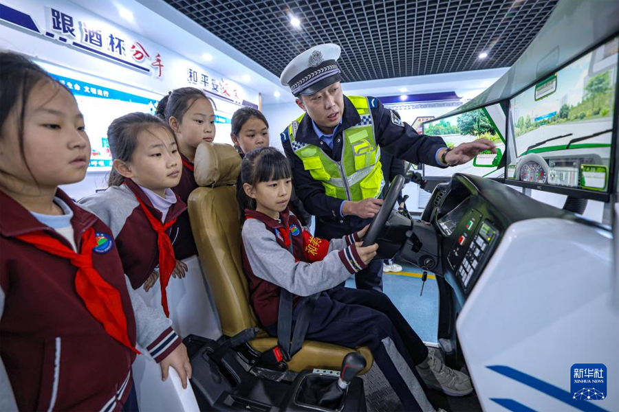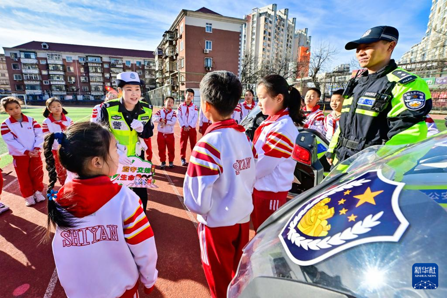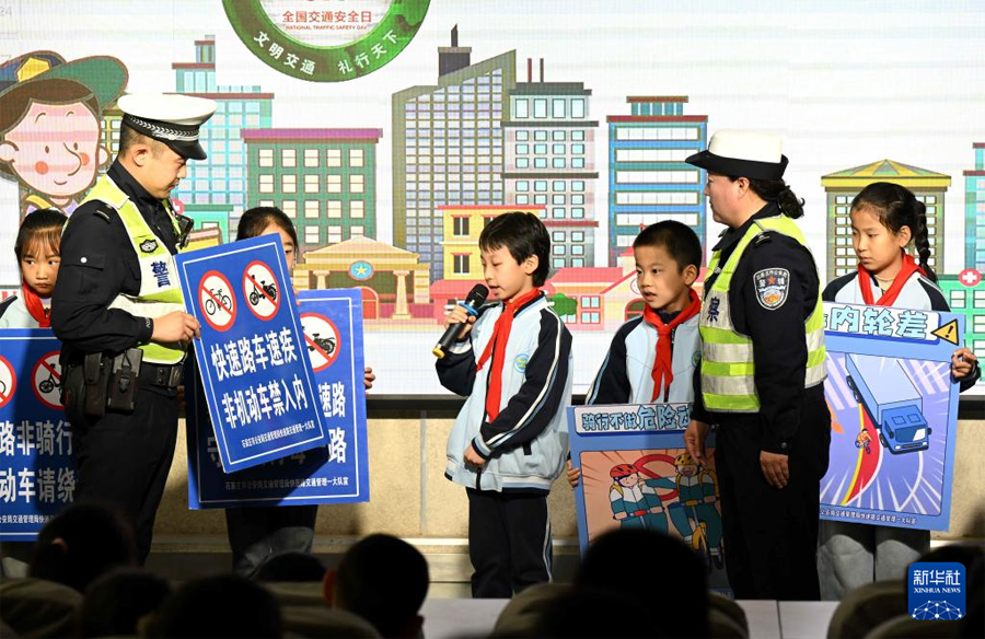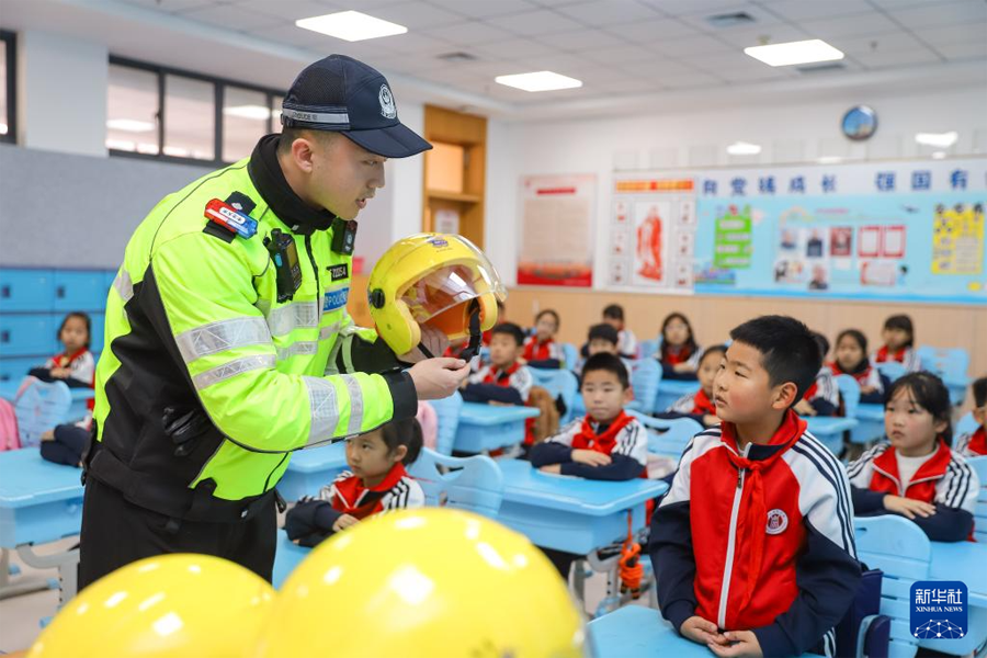 12月1日,在河北省石家庄市自强小学,民警给小朋友普及交通知识。(新华社发 陈其保/摄)