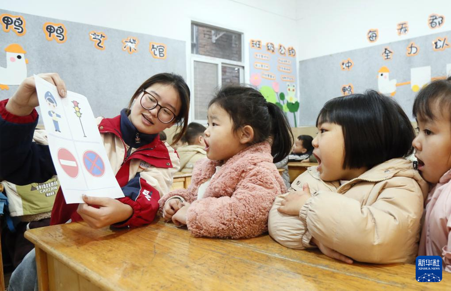 12月1日,河南省洛阳市汝阳县建桥幼儿园老师教小朋友们识别交通安全标识牌。(新华社发 康红军/摄)