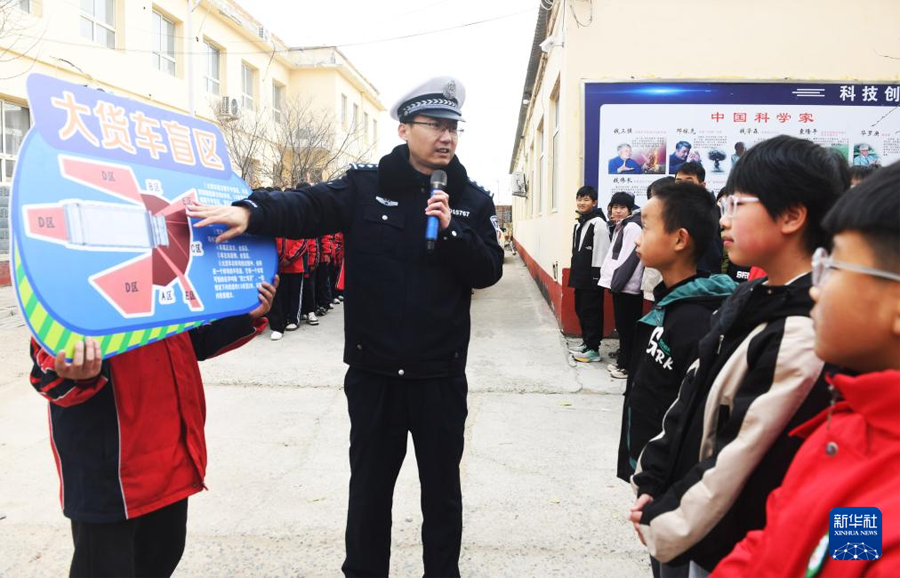 12月1日,在河北省石家庄新乐市化皮学校,民警给学生普及交通避险知识。(新华社发 贾敏杰/摄)