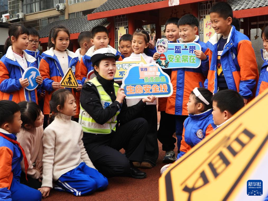 12月1日,四川省达州市公安局交通警察支队直属一大队民警在通川区实验学校给小学生宣传交通法规。(新华社发 邓良奎/摄)